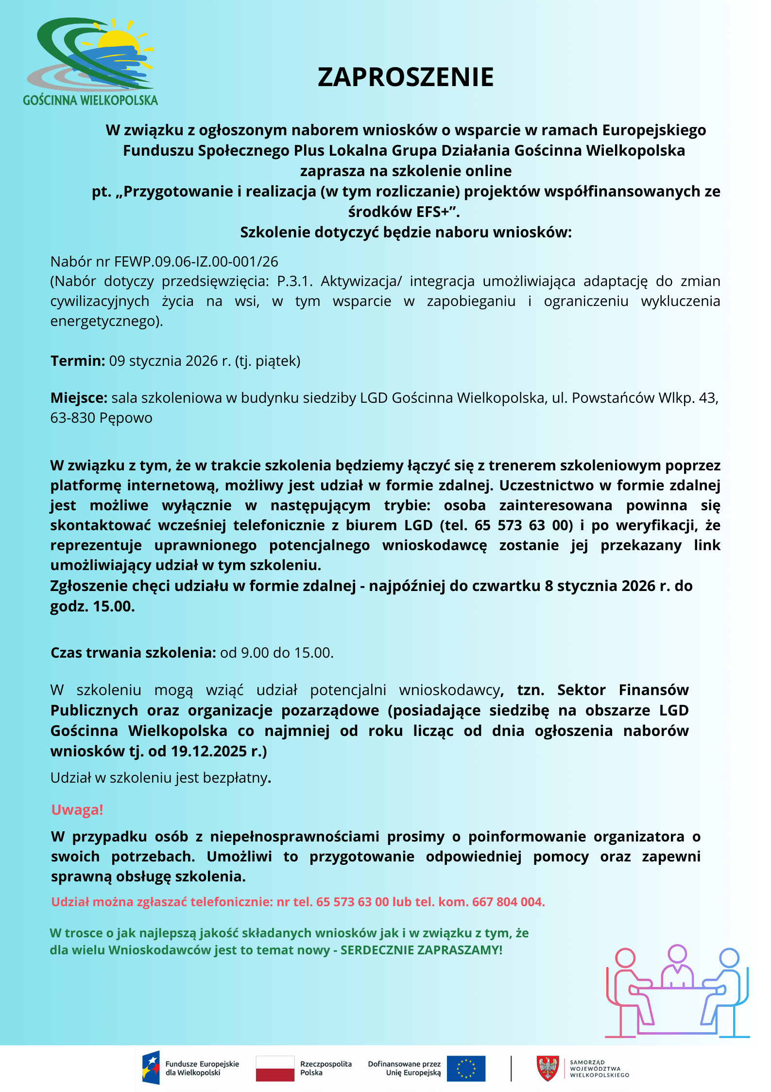 Plakat informuje o szkoleniu dla potencjalnych wnioskodawców w zakresie „Przygotowanie i realizacja (w tym rozliczanie) projektów współfinansowanych ze środków EFS+”. U góry plakatu znajduje się logo LGD Gościnna Wielkopolska. Poniżej znajdują się szczegóły szkolenia. Szkolenie dotyczy dwóch naborów wniosków: Nabór nr FEWP.09.06-IZ.00-001/26, związany z aktywizacją i integracją, umożliwiającą adaptację do zmian cywilizacyjnych na wsi, oraz wsparciem w zapobieganiu wykluczeniu energetycznemu Szkolenie odbędzie się 9 stycznia 2026 r. w godzinach 09:00-15:00 w sali szkoleniowej w siedzibie LGD Gościnna Wielkopolska w Pępowie. Potencjalni wnioskodawcy, czyli przedstawiciele Sektora Finansów Publicznych i organizacji pozarządowych z terenu LGD Gościnna Wielkopolska co najmniej od roku licząc od dnia ogłoszenia naborów wniosków tj. od 19.12.2025 r., mogą wziąć udział w szkoleniu. Szkolenie jest bezpłatne Istnieje możliwość uczestnictwa zdalnego. Aby wziąć udział w szkoleniu zdalnie, należy skontaktować się telefonicznie z biurem LGD pod numerem 65 573 63 00 do 8 stycznia 2026 r. do godz. 15:00. Po weryfikacji zostanie przesłany link do szkolenia. Osoby z niepełnosprawnościami proszone są o wcześniejsze poinformowanie organizatora o swoich potrzebach, aby umożliwić przygotowanie odpowiedniej pomocy Zgłoszenia udziału w szkoleniu przyjmowane są telefonicznie pod numerami 65 573 63 00 lub 667 804 004. Na dole plakatu znajdują się logotypy: Fundusze Europejskie dla Wielkopolski, Rzeczpospolita Polska, Dofinansowane przez Unię Europejską oraz herb Województwa Wielkopolskiego.